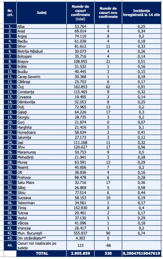 A legutóbbi tájékoztatás óta 320 új koronavírusos megbetegedést igazoltak Romániában – 164-gyel kevesebbet, mint egy nappal korábban – több mint 14.300 teszt elvégzése nyomán; 35-en újrafertőződött betegek – közölte szombaton az egészségügyi minisztérium.