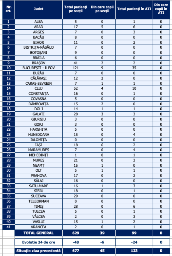 629 személyt kezelnek kórházban Covid-19-cel, 48-cal kevesebbet, mint előző nap – jelentette szombaton az egészségügyi minisztérium.