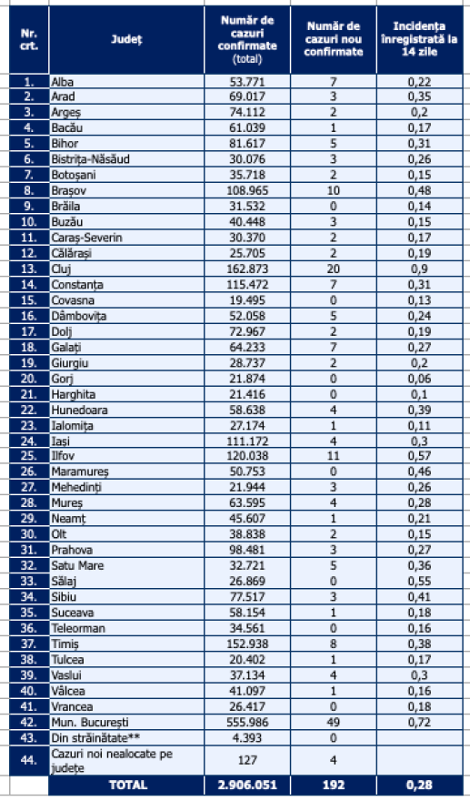 Brăila, Kovászna, Gorj, Hargita, Máramaros, Szilágy, Teleorman és Vrancea megyében egyetlen új megbetegedést sem jegyeztek.