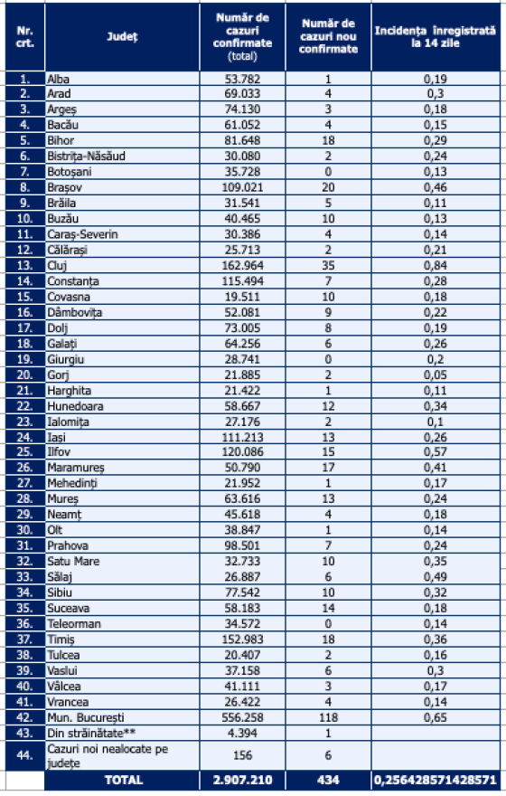 Teleorman, Giurgiu és Botoşani megyében egyetlen új megbetegedést sem jegyeztek.