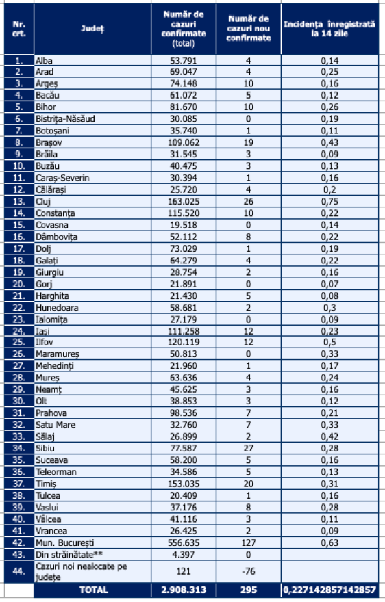 Beszterce-Naszód, Kovászna, Gorj, Ialomiţa és Máramaros megyében egyetlen új megbetegedést sem jegyeztek.