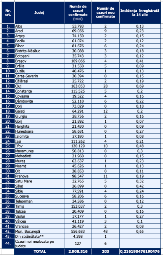 A legutóbbi tájékoztatás óta 203 új koronavírusos megbetegedést igazoltak Romániában – 92-vel kevesebbet, mint egy nappal korábban -, mintegy 9000 teszt eredményének feldolgozása nyomán; 24-en újrafertőződött betegek- közölte vasárnap az egészségügyi minisztérium.