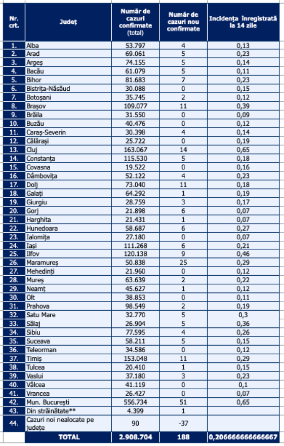 Distribuția pe județe a cazurilor per total și a celor noi