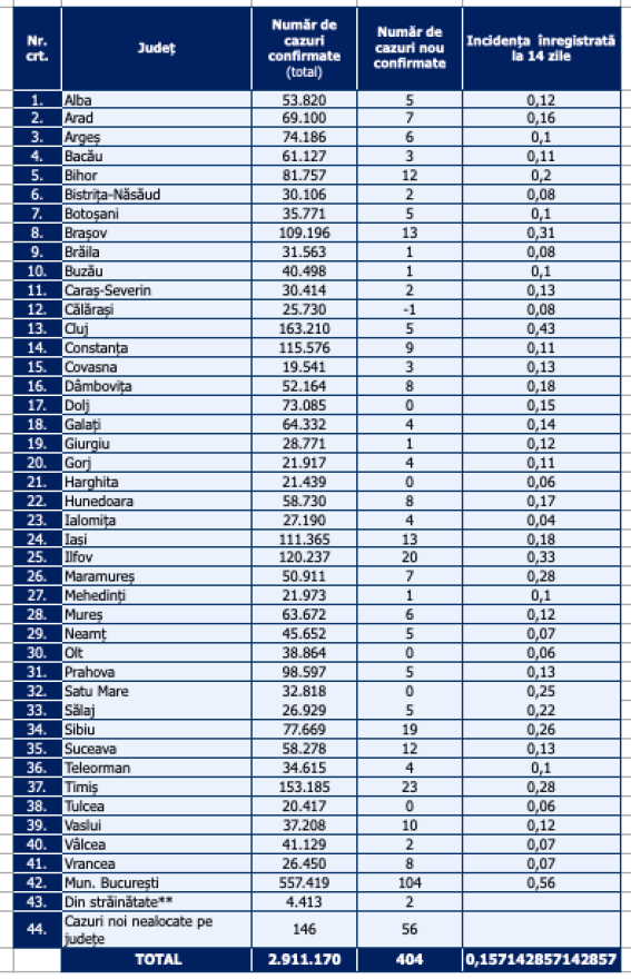 A legtöbb új esetet Bukarestből (104), illetve Temes (23), Ilfov (20) és Szeben (19) megyéből jelentették.