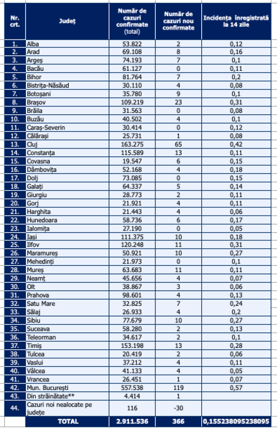 A legtöbb új esetet Bukarestből (119), illetve Kolozs (65), Brassó (23), Temes (13) és Konstanca (13) megyéből jelentették.