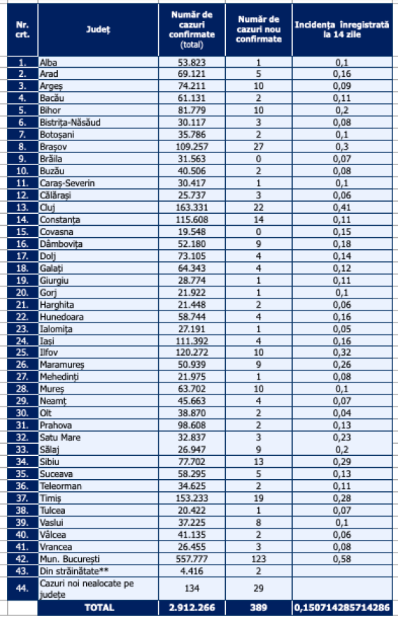 Distribuția pe județe a cazurilor per total și a celor noi