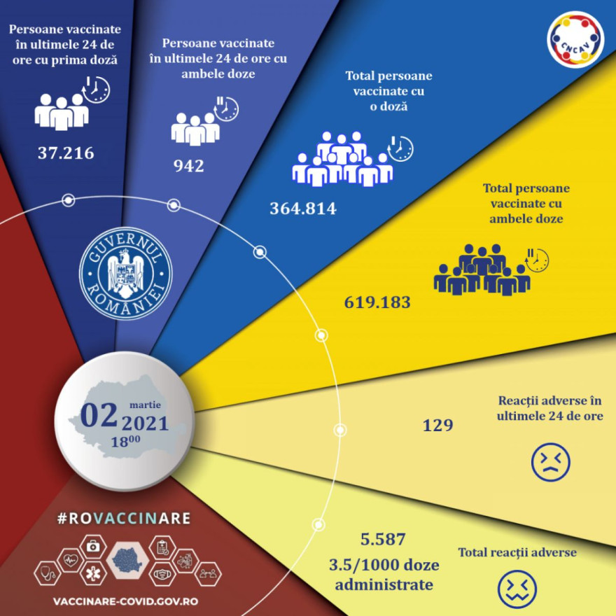Ezzel 1.603.179-re nőtt a beadott oltások száma Romániában. Az oltási kampány kezdete óta 983.997 személyt oltottak be, közülük 364.814-en az első adagot, 619.183-an pedig a második dózist is megkapták.