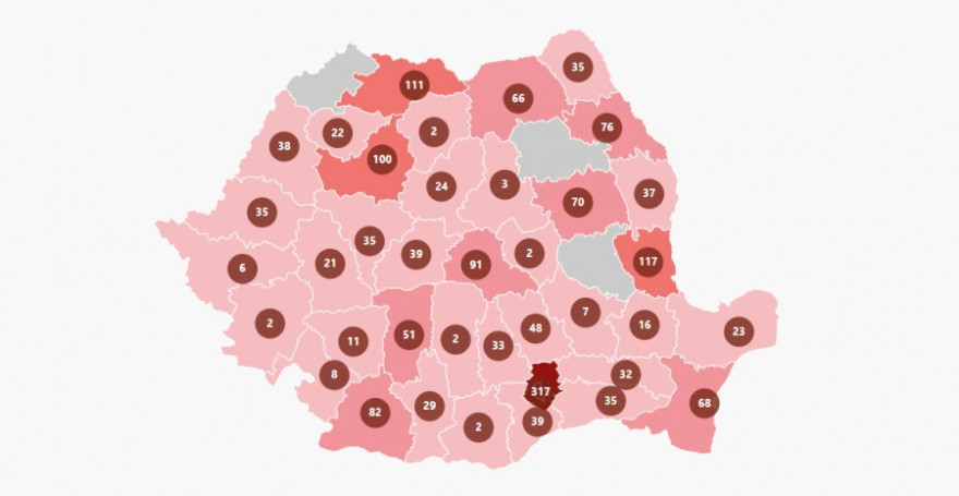 A legalacsonyabb fertőzöttségi rátát Hargita – 0,4, Gorj – 0,56, Olt – 0,72, Kovászna – 0,79 és Vrancea – 0,6 megyében jegyzik.