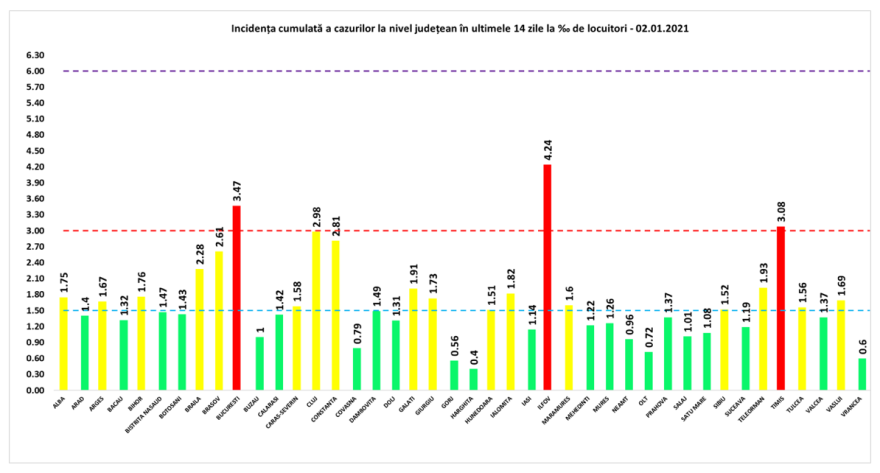 Zöld zónás megyének minősül még Arad – 1,4, Bákó – 1,32, Beszterce-Naszód – 1,47, Botoşani – 1,43, Buzău – 1,00, Călăraşi – 1,42, Dâmboviţa – 1,49, Dolj – 1,31, Iaşi – 1,14, Mehedinţi – 1,22, Maros – 1,26, Neamţ – 0,96, Prahova – 1,37, Szatmár – 1,08, Szilágy 1,01, Suceava – 1,19 és Vâlcea – 1,37 megye is.