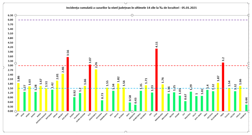 Ezzel szemben a zöld zónában 22 megye van, a legalacsonyabb fertőzöttségi rátát Hargita – 0,43, Vrancea – 0,44, Gorj – 0,58 és Olt – 0,67 megyében jegyzik.