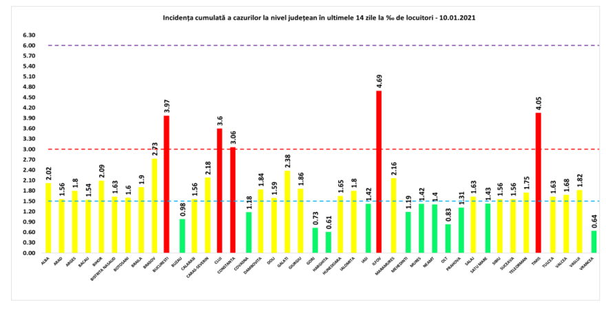 Továbbra is Ilfov megyében a legmagasabb az elmúlt 14 napban regisztrált új koronavírusos esetek száma ezer lakosra vetítve, az előző napon jegyzett 4,44-ről 4,69-re nőtt a fertőzöttségi mutató – tájékoztatott vasárnap a Stratégiai Kommunikációs Csoport (GCS).