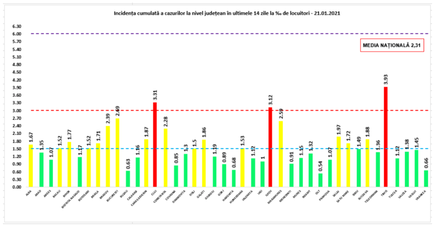 Piros zónás megye maradt Temes, ahol a fertőzöttségi ráta 3,93 ezrelék (szerdán 4,07 volt), Ilfov megye, ahol a ráta 3,12 ezrelék (szerdán 3,48 volt), valamint Kolozs megye, ahol a ráta 3,31 (egy nappal korábban 3,49 volt).