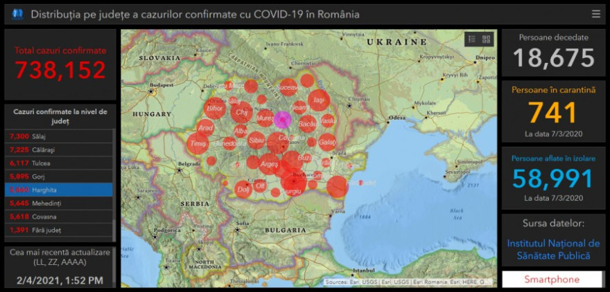 Az ország kilenc megyéje a sárga, 31 megye pedig a zöld zónába tartozik, a legalacsonyabb fertőzöttségi rátát Vrancea – 0,4, Olt – 0,44, Buzău – 0,51 és Harghita – 0,56 megyében jegyzik.