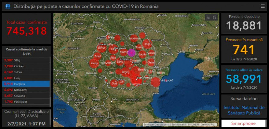 A legalacsonyabb fertőzöttségi arányt Vrancea – 0,36, Buzău – 0,52, Tulcea – 0,60, Olt – 0,61, Hargita – 0,61 és Argeş – 0,65 megyében jegyezték.