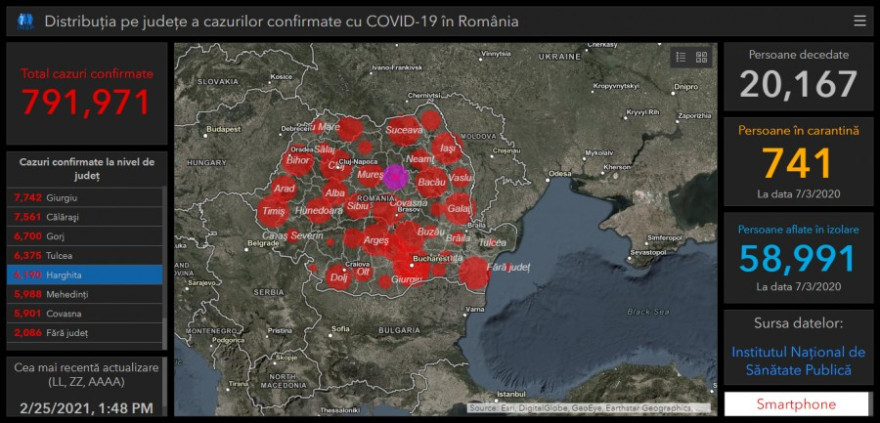 A legalacsonyabb fertőzöttségi arányt Vrancea – 0,6; Buzău – 0,6; Argeş – 0,63; Călăraşi – 0,66; Hargita – 0,66; Prahova – 0,67 és Tulcea – 0,69 megyében jegyezték.