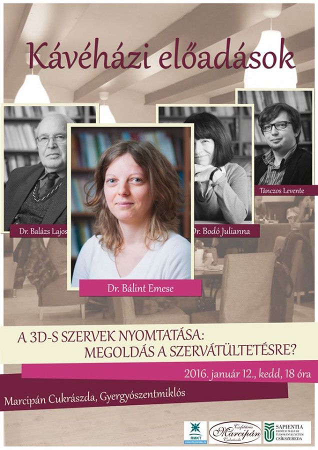 2016. január 12-én, kedden 18 órától újra ingyenes Kávéházi előadást tartanak Gyergyószentmiklóson a Marcipán Cukrászdában. Dr. Bálint Emese, a Sapientia EMTE egyetemi adjunktusa tart előadást A 3D-s szervek nyomtatása: megoldás a szervátültetésre? címmel.