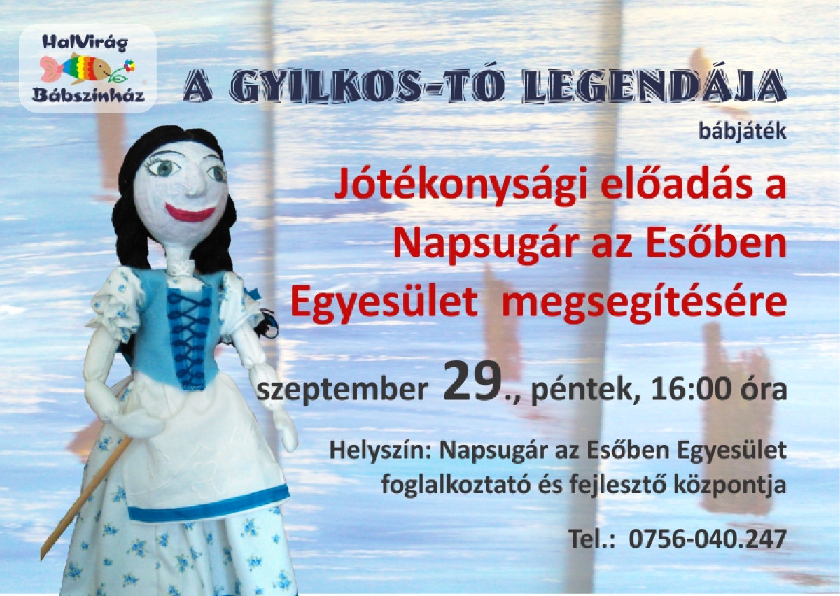 A HalVirág Bábszínház pénteken, szeptember 29-én 16 órától jótékonysági bábelőadást tart. A Gyilkos-tó legendája című bábjátékot mutatja be, az adományokat a Napsugár az Esőben Egyesületnek ajánlja fel.