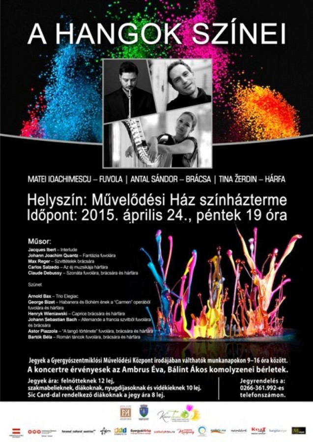 Három, Bécsben élő nemzetközi hírű zenész, Matei Ioachimescu, Antal Sándor és Tina Žerdin ad koncertet „A hangok színei” projekt keretében április 24-én, pénteken este hét órától a gyergyószentmiklósi Művelődési Ház nagytermében.