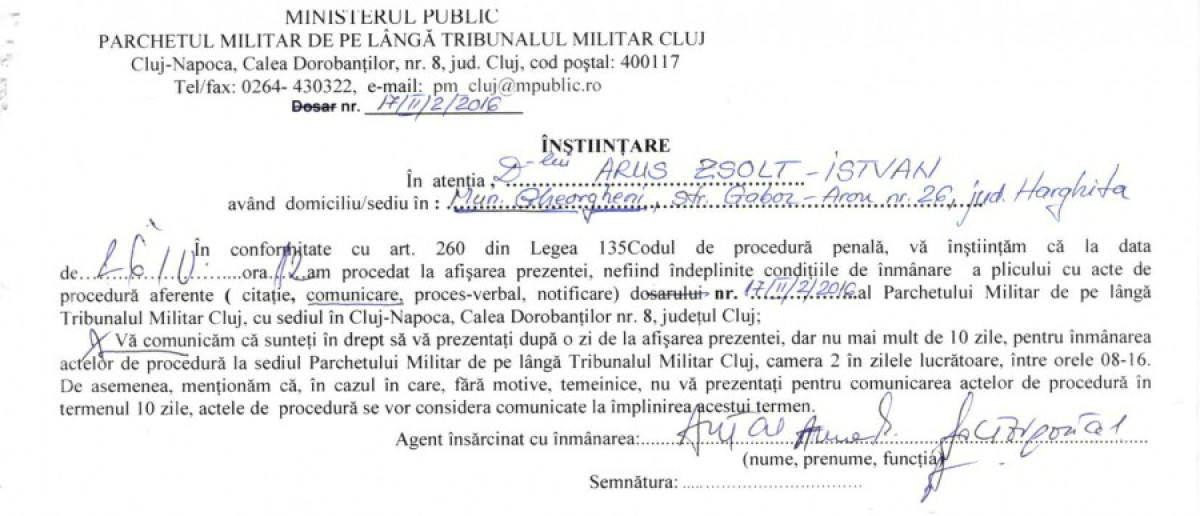 Ebben a postásunk értesít, hogy itt volt aznap 12 órakor, s mivel nem talált itthon, azért nem tudta átadni a Kolozsvári Katonai Ügyészség küldeményét. Értesít ugyanakkor, hogy eme küldemény másnap déltől arrafele, tíz napon keresztül átvehető a Katonai Ügyészség kolozsvári székhelyén. Nyilván ott is csak személyesen.