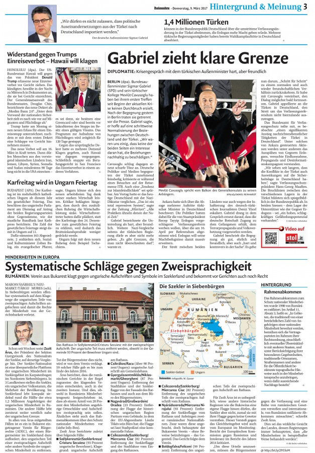 A magyar feliratok, jelképek és a székely szimbólumok elleni rendszeres romániai hadjáratokról számolt be Árus Zsolt a Dél-Tirolban (Olaszország) megjelenő Dolomiten című napilap 2017. március 9-ei számában.