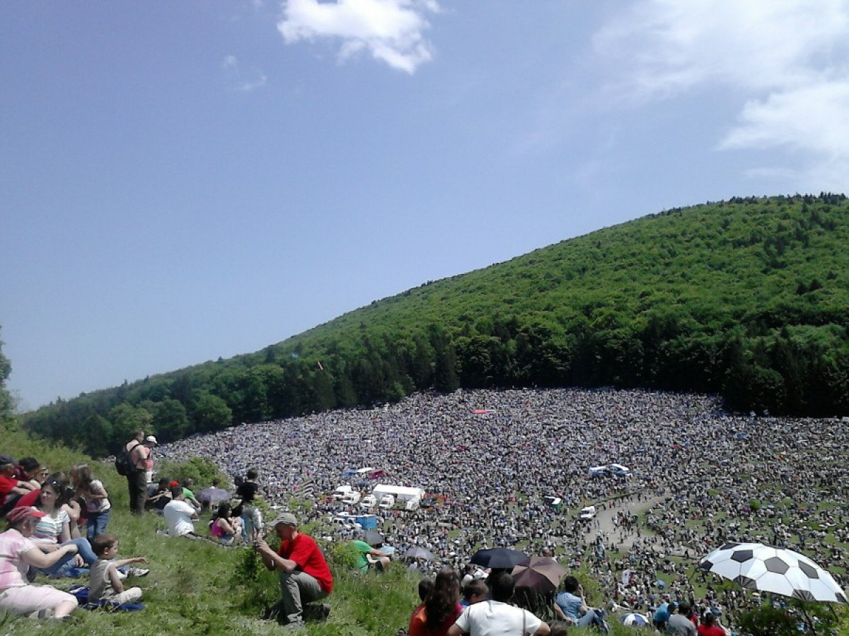 A Jézus Hágó, a keresztút végigjárása és a somlyói Hármashalom Oltárnál való közös fotó készítés megkoronázzák e napot, fáradtságunk tán most a legnagyobb, lelkünket mégis átjárja az áhítat. 2015-ben a hagyomány szerint a csíksomlyói búcsú 500-ik jubileumi évfordulója van, mely még különlegesebbé tette az idei eseményt. Feltöltődve nyugovóra térünk hát, hogy másnap újult erővel ébredjünk és részt vegyünk a kereszténység és a magyarság ünnepén. Az ébredés már olajozottabb és reményekkel teli, amikben aztán nem is kell csalódnunk. Korán felmegyünk a nyeregbe, hogy kényelmesen közlekedhessünk, de már ekkor érezhető, valami nagy készül. Ahogy az idő telik megelevenedik előttem, amit eddig csak a tv-ben láthattam: Magyarok százezrei a világ és a Kárpát-medence minden tájáról jönnek ide, hogy láthassák Csíksomlyó ragyogó csillagát. A hidegrázás folyamatos és megszokott érzéssé vált ekkora már, ami tetőfokára akkor hág, mikor a nemzeti imádságaink éneklésébe kezdünk.