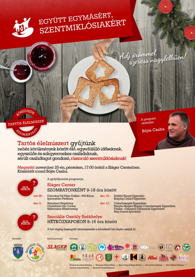 Idén immár 3. alkalommal indul útjára az Együtt Egymásért – Szentmiklósiakért adománygyűjtési program, amely több száz rászoruló család ünnepi készülődését segítette tartós élelmiszercsomaggal az elmúlt két évben. Idén is több mint harminc civil szervezet, egyházi felekezet, és cég vállalt partnerséget az önkormányzat szociális osztálya által kezdeményezett programban.