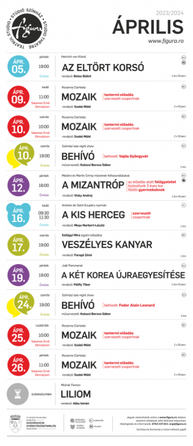 Áprilisban a Figura Stúdió Színház öt előadását láthatja a közönség, a felnőtt előadások mellett tantermi előadásainkat is műsorra tűzzük ebben a hónapban.
