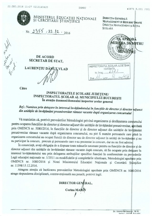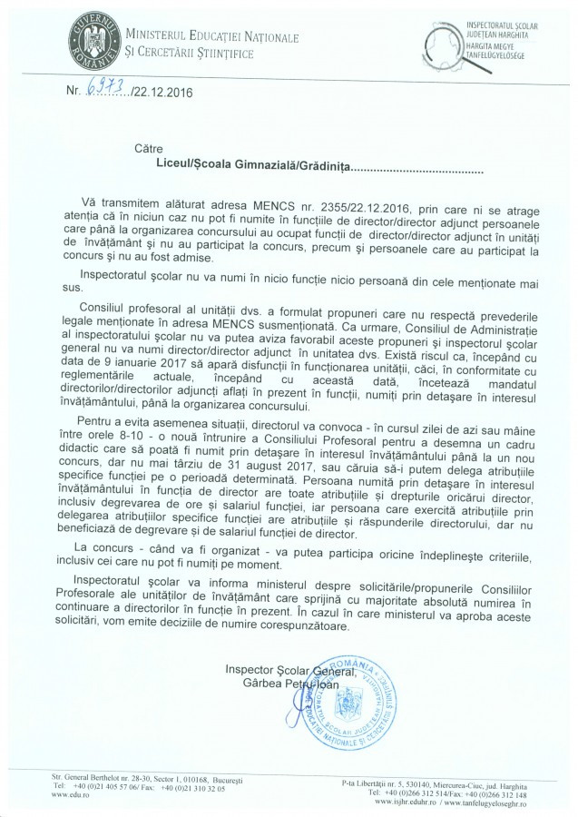 Fenyegető levelet küldött az oktatási miniszter a tanfelügyelőségen keresztül azon tantestületeknek, amelyek támogatták tisztségükben azon iskolaigazgatókat, akik korábban sikertelenül versenyvizsgáztak, vagy nem vizsgáztak, kijelentve, hogy azoknak nem ad kinevezést. Hargita Megye Tanácsának elnöke, Borboly Csaba, illetve alelnöke, Barti Tihamér egy nappal korábban, december 21-én gratulált ezen testületeknek, mint Borboly Csaba fogalmazott, „bátor és felelős döntést hoztak”, és felhívással fordultak az oktatási minisztériumhoz, hogy módosítsák a diszkriminatív rendeletet, és tegyék lehetővé, hogy folytathassák munkájukat azok az igazgatók, akikkel a tanárok meg vannak elégedve. A megyeelnök hozzátette: arra számítottak, hogy az oktatási miniszter felülbírálja korábbi döntését, és módosítja a diszkriminatív rendeletet, ám nem így történt, és az új helyzet felelősségteljes döntés elé állítja az érintetteket.