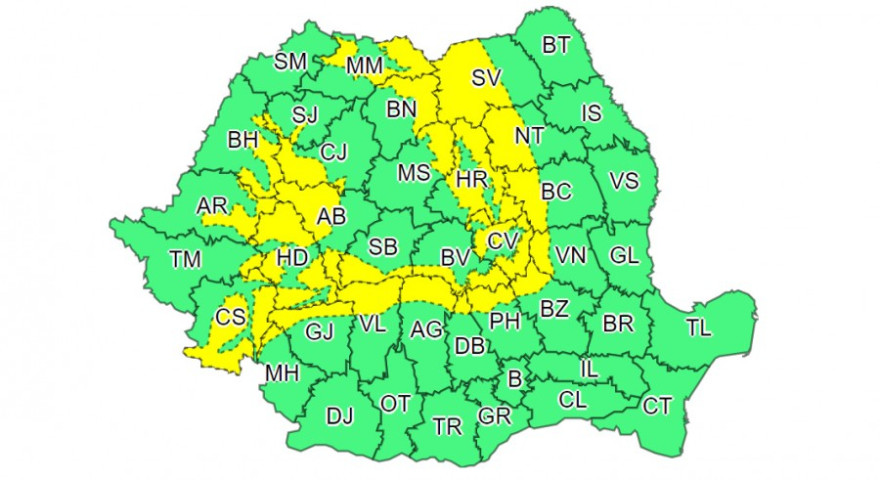 Ugyanakkor péntek 20 órától vasárnap 18 óráig az ország 26 megyéjében 1800 méter fölött 80-90 km/h-nál nagyobb sebességű szél és hóviharok várhatók, a látótávolság csökken. A sárga jelzésű figyelmeztetés szerint a Déli-Kárpátok nyugati részében lehulló csapadékmennyiség eléri a 30-40 litert négyzetméterenként.