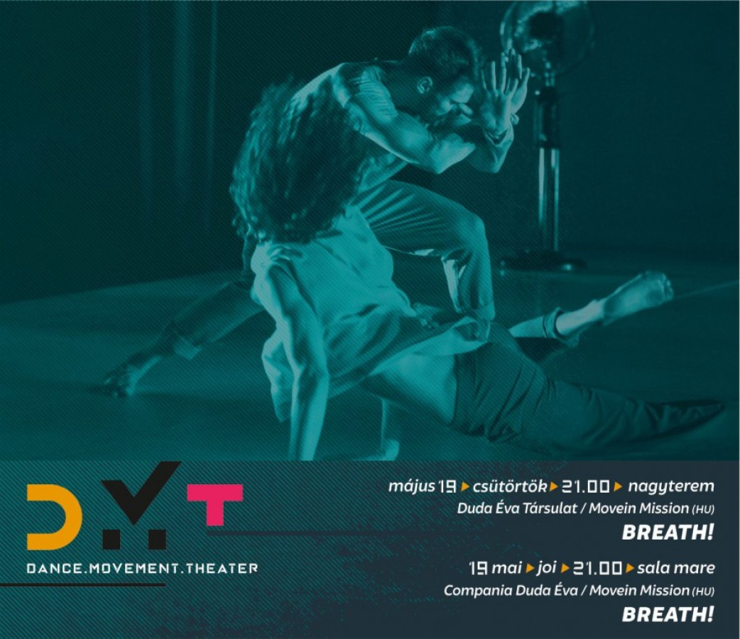 Május 19-én, csütörtök este 9 órától a Figura Stúdió Színház nagytermében a Duda Éva Társulat / Movein Mission BREATHE! című előadásával folytatódik a VI. dance.movement.theater második napja. Szeretettel várnak mindenkit!