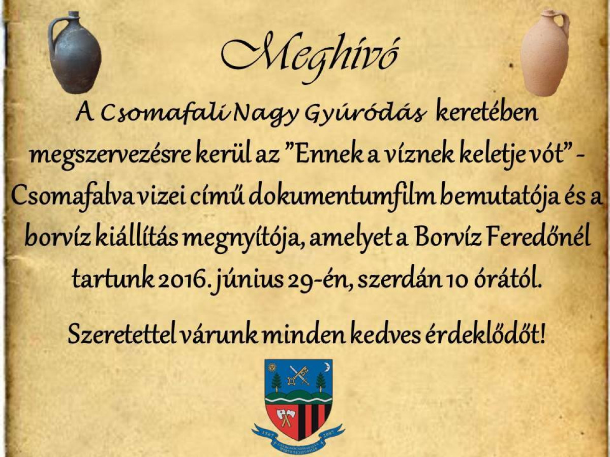 10:00 – „Ennek a víznek keletje vót” – Csomafalva vizei című dokumentumfilm bemutatója és a borvízkiállítás megnyitója