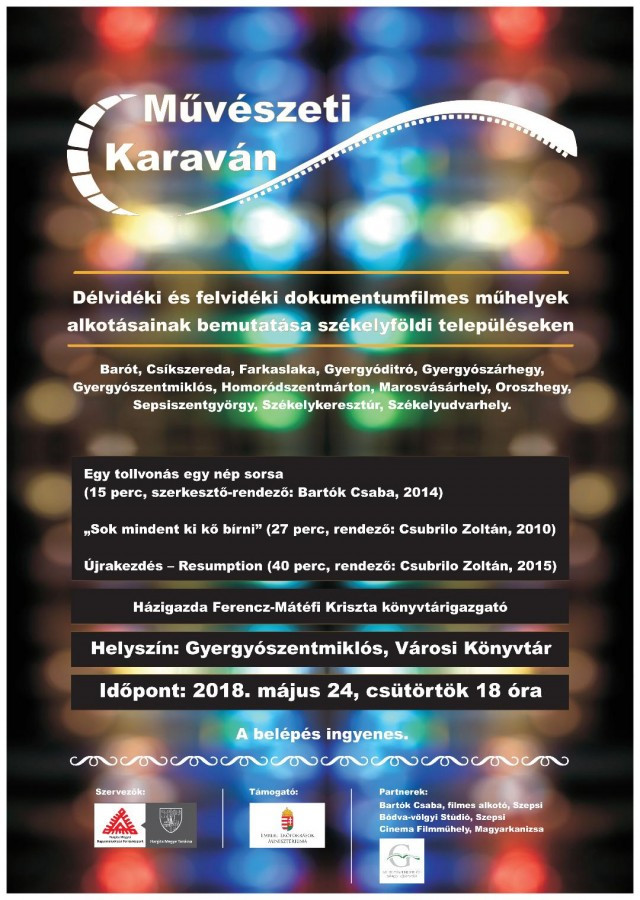 Hargita Megye Tanácsa és a Hargita Megyei Hagyományőrzési Forrásközpont a gyergyószentmiklósi Városi Könyvtárral, a budapesti Emberi Erőforrások Minisztériuma támogatásával délvidéki és felvidéki dokumentumfilmes műhelyek alkotásait mutatja be a Városi Könyvtárban 2018. május 24-én, csütörtökön 18 órától. A Művészeti Karaván elnevezésű program célja délvidéki és felvidéki dokumentumfilmes műhelyek alkotásainak bemutatása székelyföldi településeken április és május hónapok során. Az esemény szervezésének partnere a gyergyószentmiklósi Városi Könyvtár, házigazda Ferencz-Mátéfi Kriszta könyvtárigazgató. Gyergyószentmiklóson a következő alkotásokat vetítik: