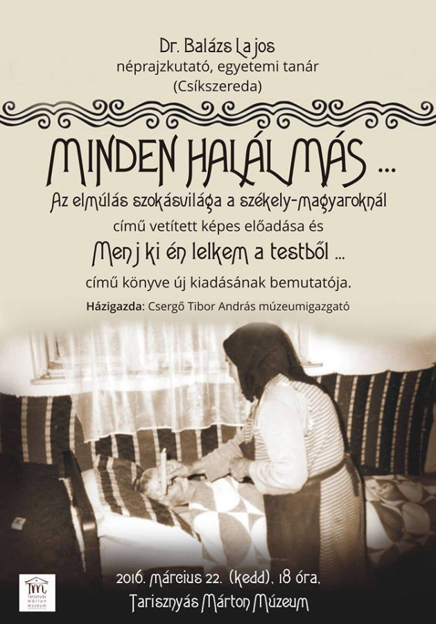 Szeretettel várjuk a Tarisznyás Márton Múzeumba 2016. március 22-én 18 órától dr. Balázs Lajos Minden halál más című előadására, valamint Menj ki én lelkem a testből című könyvének bemutatójára.