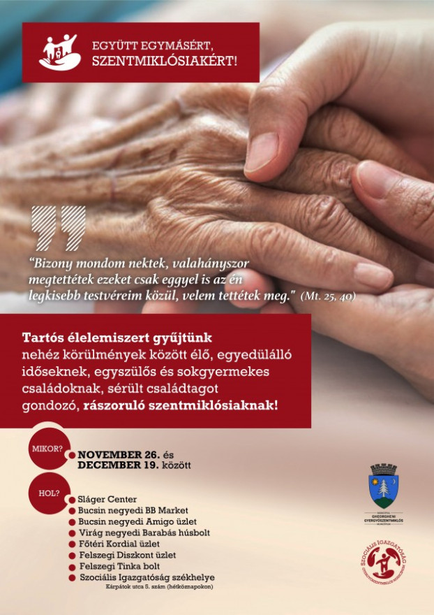 2021-ben az Együtt Egymásért, Szentmiklósiakért program szervezőiként és résztvevőiként is fokozottan vigyáznunk kell egymás egészségére, így – mindannyiunk érdekében – kerülnünk kell a nagyobb létszámú események szervezését, a tartósélelmiszer-gyűjtés viszont, a biztonsági előírások betartásával ezúttal is változatlanul megvalósul a november 26. és december 19. közötti időszakban.