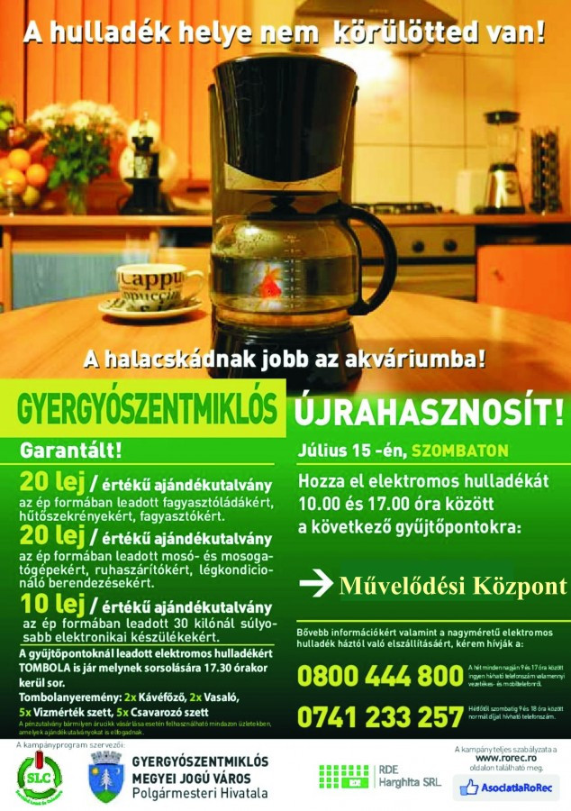 Gyergyószentmiklóson, július 15-én szombaton, 10 és 17 óra között megszabadulhat a lakosság a régi vagy meghibásodott elektromos hulladékától (bármilyen készülék amely árammal vagy elemmel működik), a gyűjtőautó és a Művelődési Központnál felállított gyűjtőpont szolgáltatásának igénybevételével.