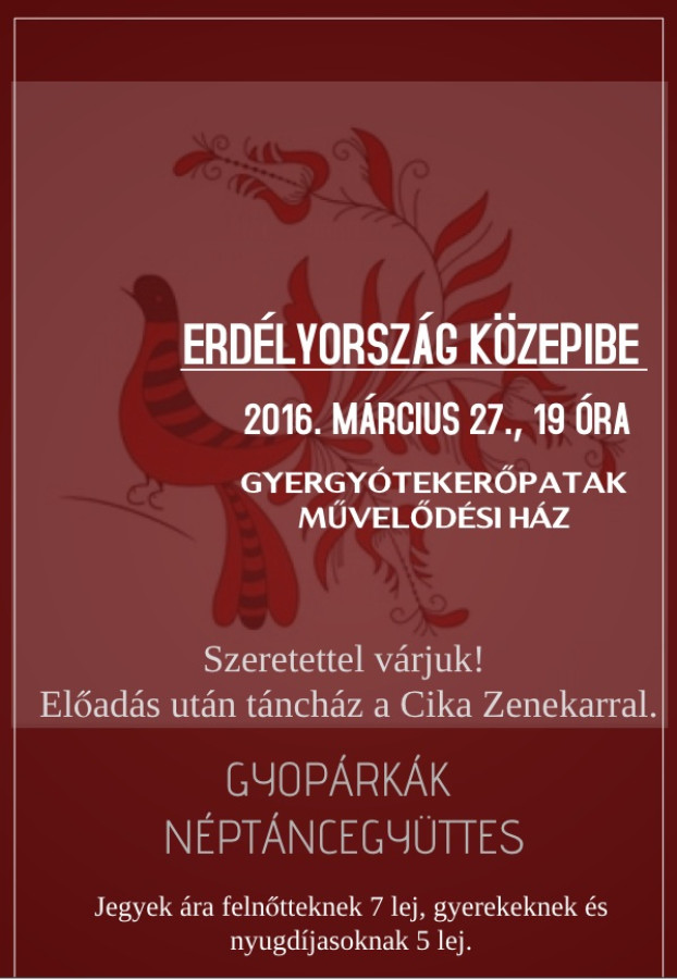 A Gyopárkák Néptáncegyüttes Erdélyország közepibe című előadását tekintheti meg az érdeklődő 2016. március 27-én, húsvétvasárnap 19 órától a gyergyótekerőpataki művelődési házban.