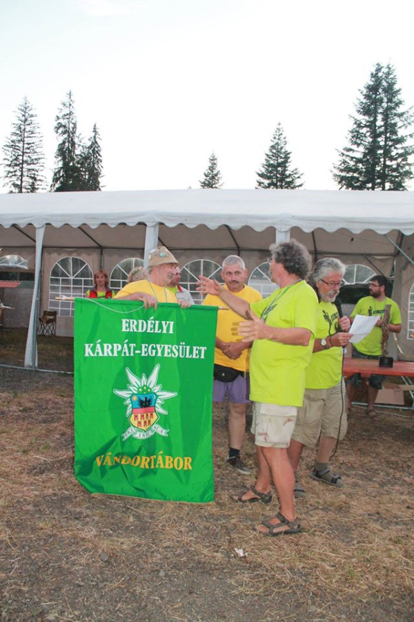 Vadász Szatmári István, az EKE Gyergyói Osztályának elnöke átadja a tábori zászlót Dukrét Lajosnak, a jövő évi, XXVI. EKE Vándortábort szervező EKE Háromszéki Osztály elnökének