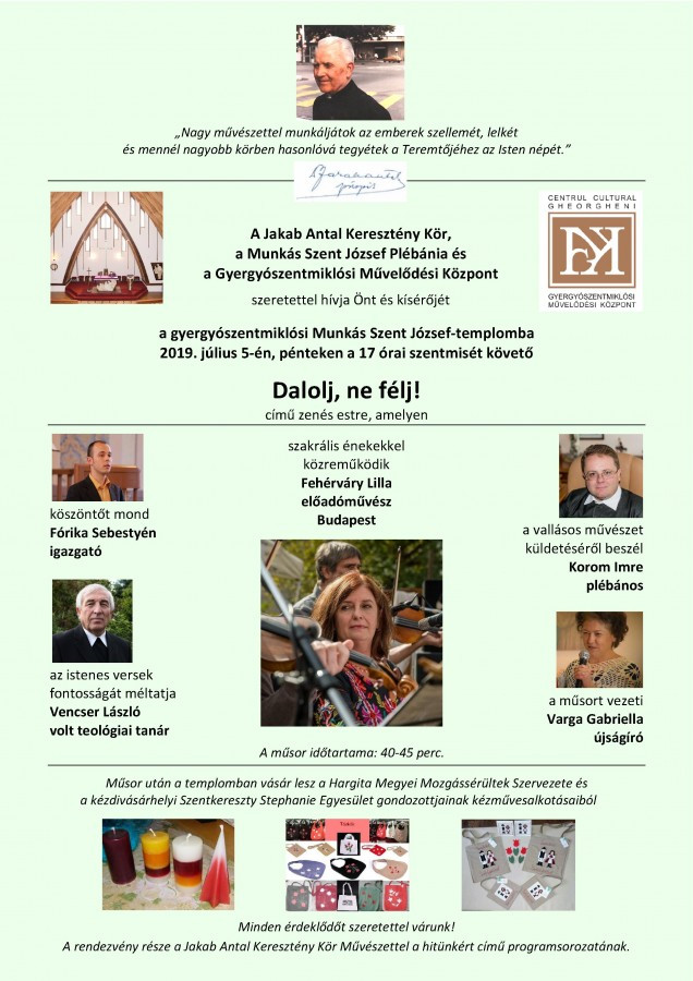 – Mivel a dalok beszélgetős műsorba ágyazódnak, annak fonala jelöli majd ki, hogy az előkészített repertoárból mely énekek hangozzanak el. Mindenképpen figyelembe veszem a székely nép máriás lelkületét; az istenes versek ünnepét, amelyre Gérecz Attila születésének 90., Sík Sándor születésének 130., Ady Endre halálának 110. évfordulója ad alkalmat. Alig néhány nappal leszünk a keresztény vértanúk emléknapja és Sarlós Boldogasszony ünnepe után; meghívóm, a Jakab Antal Keresztény Kör névadója 110 éve született. Olyan jeles napok, évfordulók találkozásában rendezzük meg ezeket az esteket, amelyre a nép ajkáról felfakadó és a költők tollából megszülető imák szavával lehet a legmegfelelőbben válaszolni. Szeretnék a szívekig elérni, és szeretném, ha ebben a gazdag ünnepkörben a mindnyájunk nevében felzengő énekszavak és dallamok a Csíksomlyói Szűzanya és minden égi pártfogónk lelkét is megérintenék, mi pedig ott éreznénk magunkat, ahol a költő szerint is minden fel van írva: Isten tenyerén.