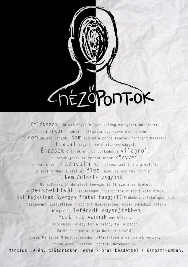 Most itt vannak egy helyen. Felolvassuk őket, túl a falon, túl a padon. Máthé Annamária, Moşu Norbert-László, Boros Mária és Miholcsa Zsombor előadásában elhangzanak versek, gondolatok, nézetek, pontok. Nézőpont.ok.