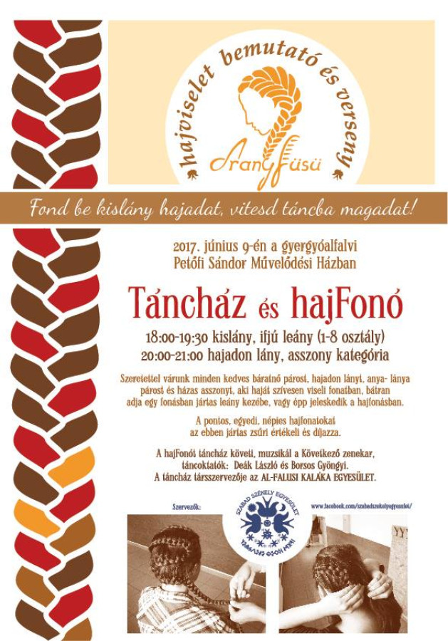Hajfonatbemutatót és versenyt szervez a Szabad Székely Egyesület, melyre szeretettel várunk minden hajadon lányt, barátnő párost, anya- lánya párost és házas asszonyt, kislánytól a nénikéig mindenkit, aki haját szívesen viseli fonatban, bátran adja egy fonásban jártas leány kezébe, vagy épp jeleskedik a hajfonásban.
