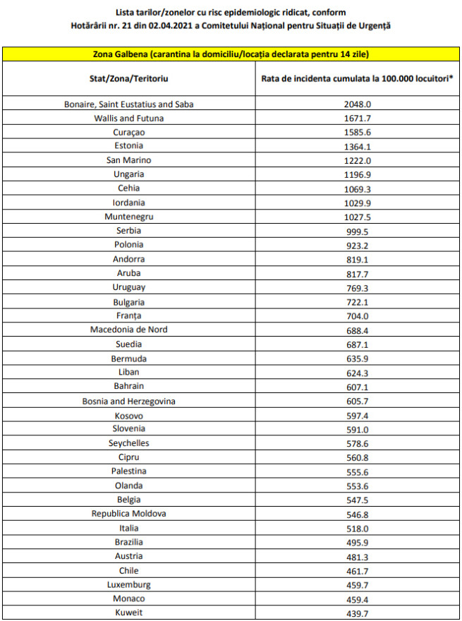 Aktualizálta péntek este az Országos Vészhelyzeti Bizottság (CNSU) a járványügyi kockázatot jelentő, sárga zónás országok jegyzékét.