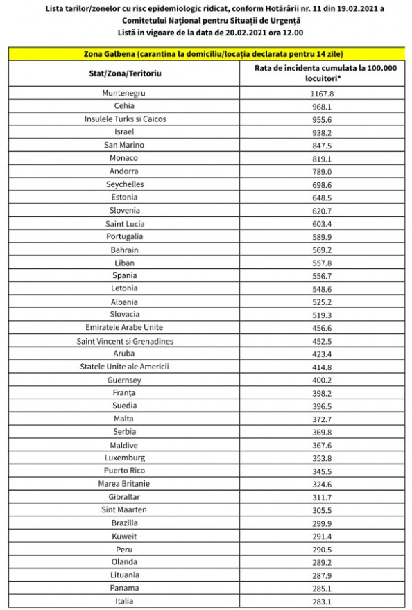 Aktualizálta pénteken az Országos Vészhelyzeti Bizottság (CNSU) a járványügyi kockázatot jelentő, sárga zónás országok jegyzékét. A listán szereplő államokból Romániába érkezőknek 14 napra karanténba kell vonulniuk.