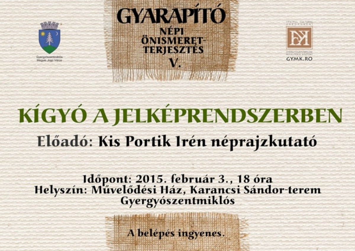 Mindenkit szívesen látunk!Kígyó a jelképrendszerben címmel tart előadást Kis Portik Irén néprajzkutató február 3-án, kedden 18 órától a gyergyószentmiklósi Művelődési Ház Karancsi Sándor-termében.