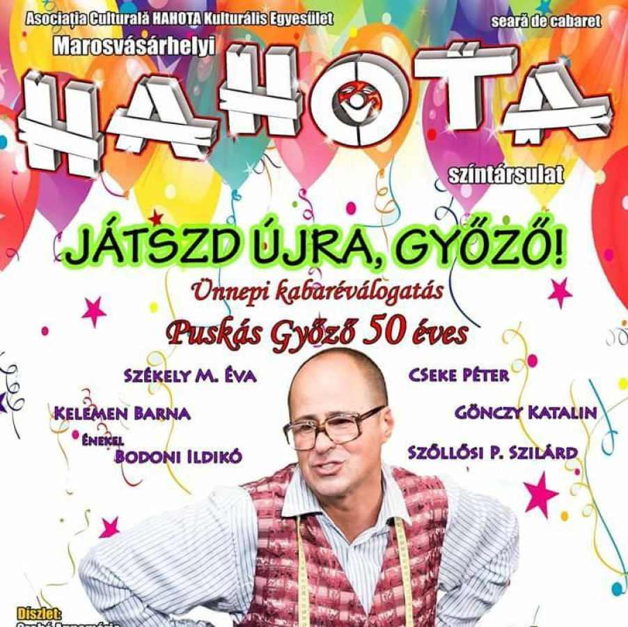 A marosvásárhelyi Hahota Színtársulat november 6-án hétfő és 7-én kedd este 7 órától a gyergyószentmiklósi Figura Stúdió Színház nagytermében viszi színre a „Játszd újra, Győző!” című nagysikerű ünnepi kabaré-előadását.