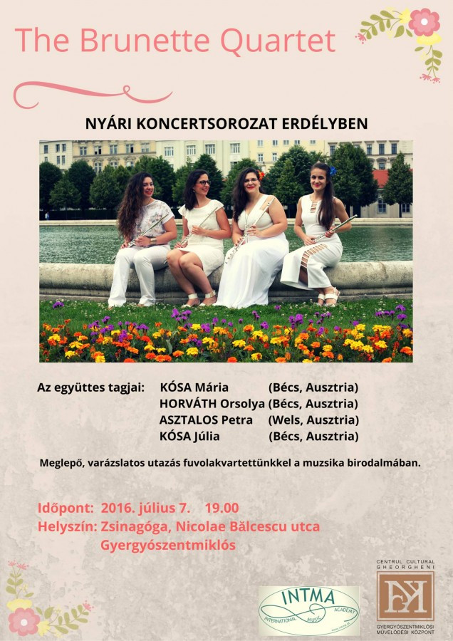 Székelyföldi turnéja keretében július 7-én, csütörtökön este 19 órától Gyergyószentmiklóson koncertezik a bécsi The Brunette Quartet, melynek két tagja, Kósa Mária alapító-zenekarvezető és Kósa Júlia is gyergyószentmiklósi.