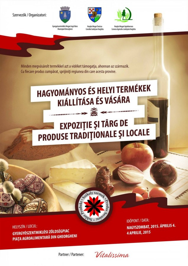 Hargita Megye Tanácsa, a Hargita Megyei Agrárkamara és Gyergyószentmiklós Önkormányzata szervezésében HAGYOMÁNYOS ÉS HELYI TERMÉKEK KIÁLLÍTÁSA ÉS VÁSÁRA Nagyszombaton, a gyergyószentmiklósi zöldségpiacon 8-15 óra között.