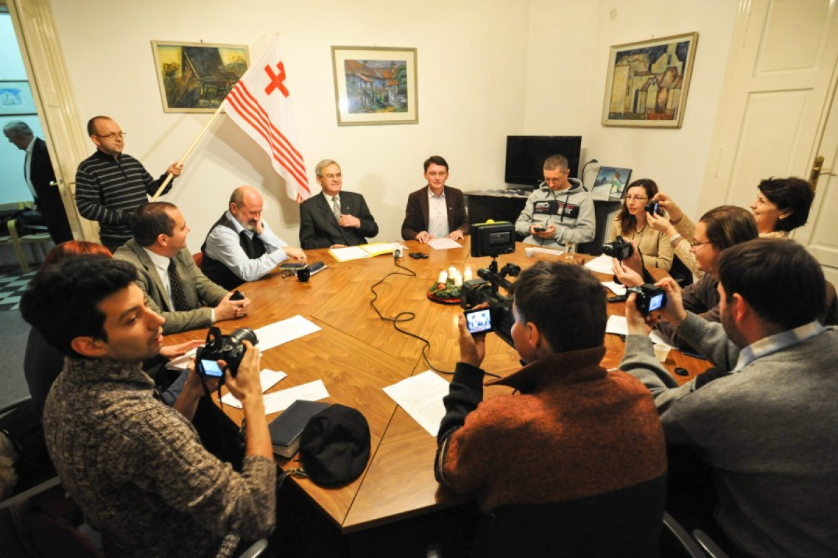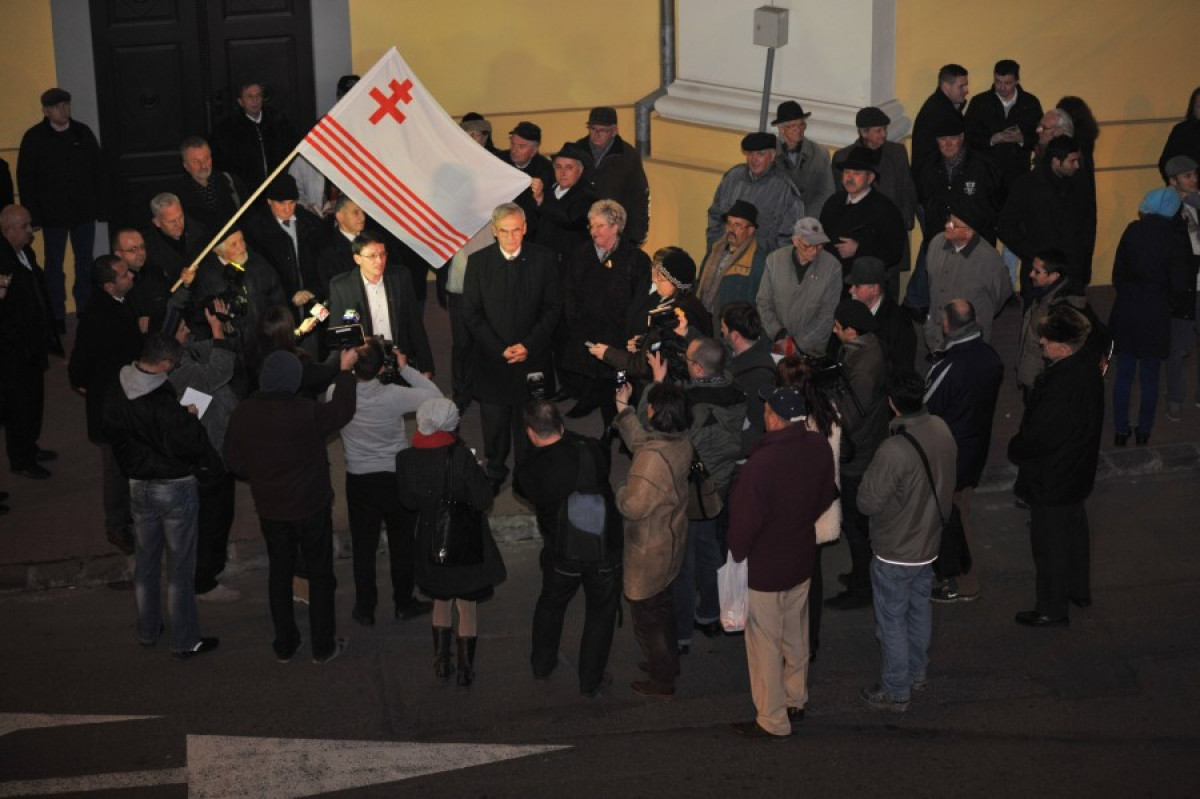 A tegnap esti akció azt volt hivatott jelképezni, hogy ennek a szolidaritásnak és szabadságvágynak most különösen meg kell nyilvánulnia, ugyanis épp ezekben a napokban-hetekben élénkült meg az a vehemens magyarellenes kampány, amelyet a mindenkori román hatalom hovatovább egy évszázada folytat, kisebb-nagyobb intenzitással – hangzott el a zászlókitűzést megelőző sajtótájékoztatón. Tőkés László európai parlament képviselő ezúttal Csomortányi Istvánnal, a PAT alelnökével, az Erdélyi Magyar Néppárt Bihar megyei elnökével együtt informálta a magyar és a román médiát közösségi szimbólumaink hatósági üldöztetéséről, amelyhez tevőlegesen hozzájárul a „demokratikus, pártatlan, jogállami” román igazságszolgáltatás. Legutóbb a Bihar Megyei Törvényszék minősítette – immár jogerősen – reklámzászlónak a nagyváradi EP-iroda erkélyén lobogó székely zászlót, jóváhagyva az önkormányzatnak a magyar közösségi jelkép levételére szólító, súlyos pénzbüntetést kilátásba helyező felszólítását. A sajtótájékoztatón elhangzott: nem csak Tőkés László követett el „kihágást” a székely zászló kitűzésével, hiszen sokasodnak a retorziók szerte Erdélyben. Sorozatos támadások érik azokat, akik a magyar nemzeti szimbólumokat kitűzik, felmutatják, használják. Román nacionalista elemek a hatóságok szemhunyása, sőt segédlete mellett gyalázzák az erdélyi magyarok nemzeti jelképeit, érzéseit, törekvéseit, történelmét és nyelvét. A partiumi zászló kitűzésével nemcsak a régió önrendelkezése mellett állunk ki, hanem a romániai, állami túlkapások ellen is tiltakozunk – hangzott el a sajtótájékoztatón.