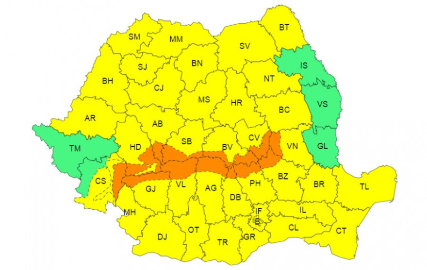 A másodfokú riasztás Hunyad, Fehér, Szeben, Gorj, Vâlcea, Argeş, Dâmboviţa, Prahova, Konstanca és Tulcea megyére terjed ki.