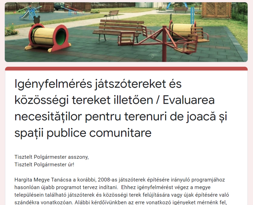 Mivel az önkormányzatoknak anyagilag megterhelő egy játszótér kialakítása, ezen a programon keresztül az intézmény társfinanszírozásban kívánta támogatni Hargita megye településeinek ez irányú törekvéseit.