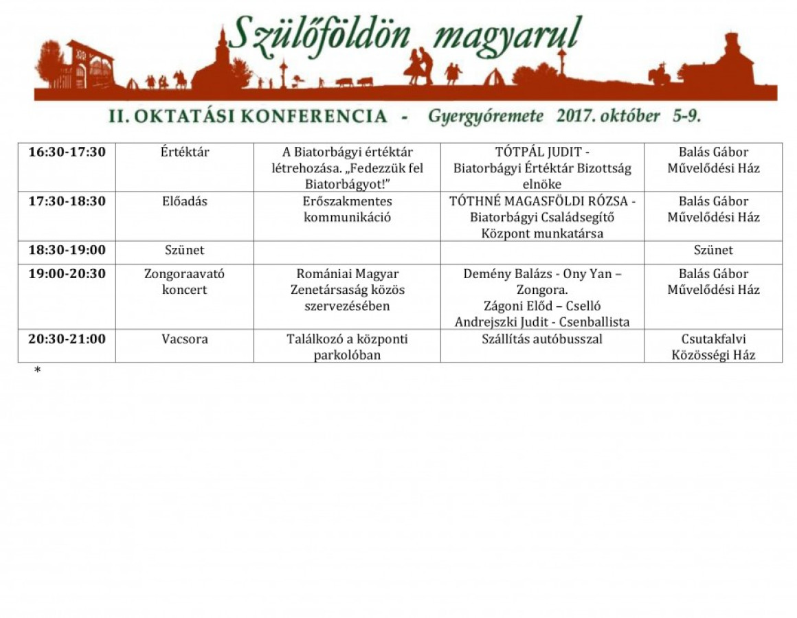 Szülőföldön magyarul címmel községünk oktatási konferenciának ad otthont 2017. október 5-9 között, mely második alkalommal kerül megszervezésre, a tavaly októberben Nagydobronyban megtartott konferencia folytatásaként. Az eseménysorozatra többfős küldöttség érkezik Biatorbágy testvér-településünkről, Alistálról (Szlovákia) és Nagydobronyból (Ukrajna – Kárpátalja). A helyi illetve a vendég önkormányzati képviselők és oktatásban dolgozók szakmai előadásokon, fórumokon vesznek részt a négy nap alatt.
